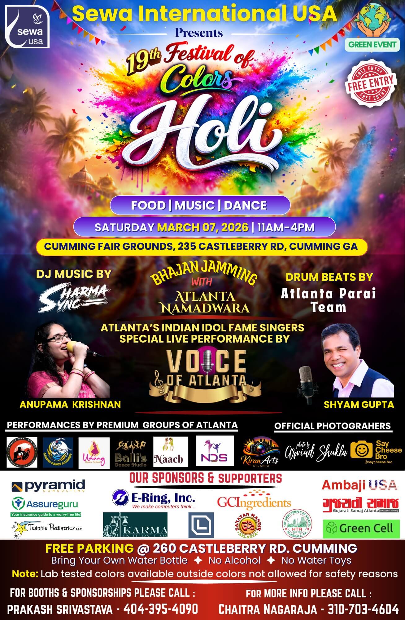 Get ready for the Largest Holi Celebration in the Southeast at Sewa Internationalβs 19th Annual Festival of Colors, happening on Saturday, March 7, 2026, at the Cumming Fairgrounds in Cumming, Georgia.