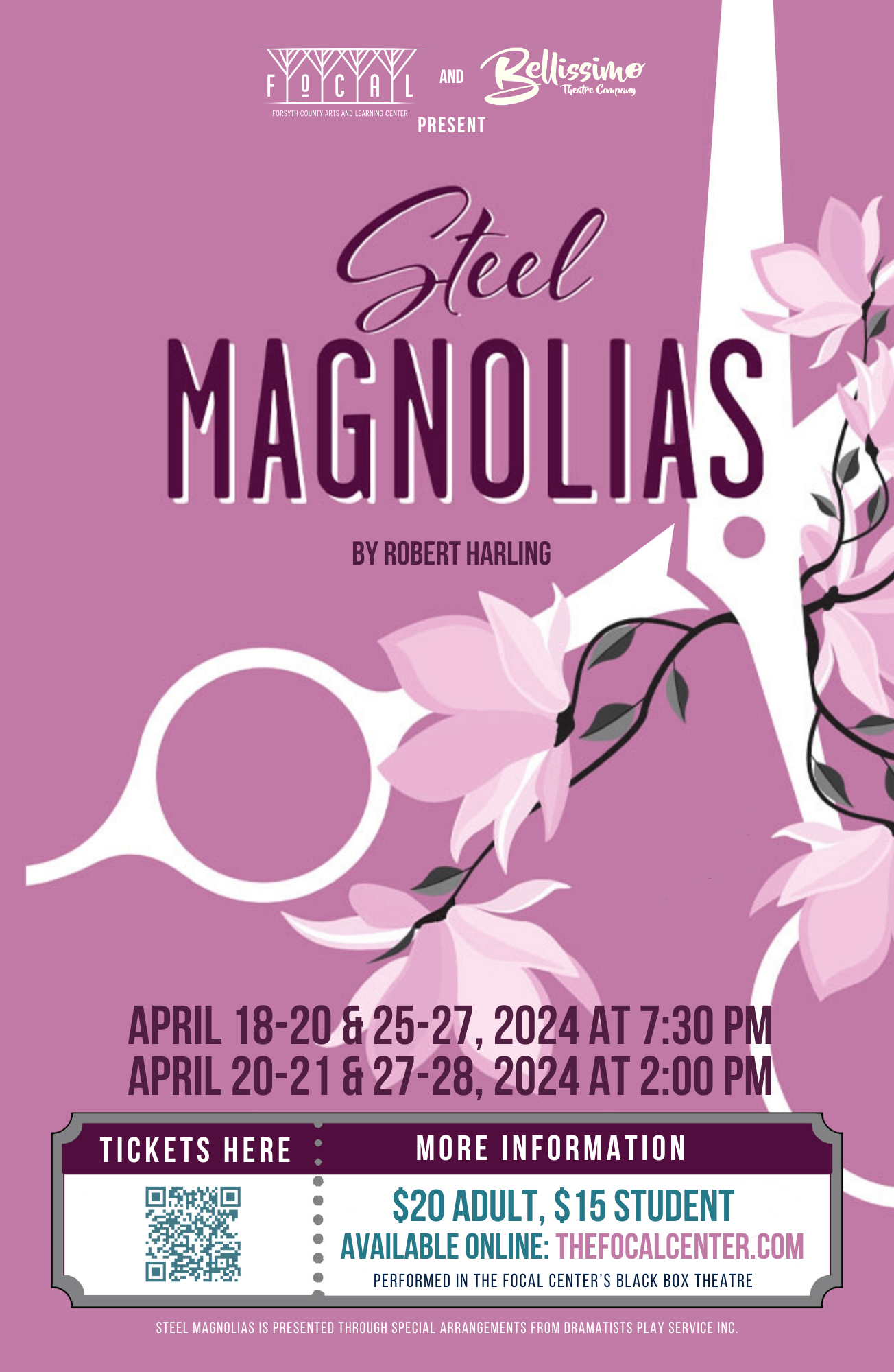 Bring your family and friends to watch Steel Magnolias by Robert Harling as the Bellissimo Theatre Company brings this classic story about Truvy Jones to the Forsyth County Arts and Learning Center in Forsyth County, Georgia.